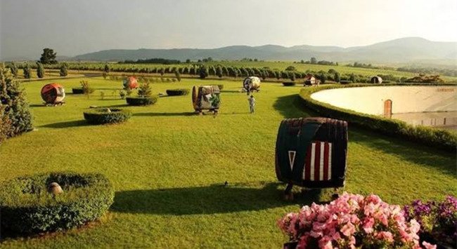 格魯吉亞葡萄酒釀造工藝獨具特色,雖然也運用歐洲釀酒方式,但很多酒莊仍沿用著最為傳統(tǒng)的“克韋夫利”(kvevri)釀酒法。這種圓錐型的特制陶罐,容量可達3000-5000升,裝滿葡萄汁后埋入圖中,只將罐口露出地面,埋入土中的罐子就可使葡萄汁在適宜溫度下發(fā)酵,并且使葡萄酒在良好狀態(tài)下保存相當長時間。