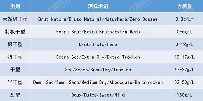 與靜止酒不同,起泡酒根據(jù)糖分含量對葡萄酒的劃分更為細(xì)致,含糖量由低到高可分為天然極干型、特極干型、極干型、特干型、干型、半干型和甜型七個類型。在使用傳統(tǒng)法(Traditional Method)、轉(zhuǎn)移法(Transfer Method)或罐中發(fā)酵法(Tank Method)釀造起泡酒時,酒液在最終封瓶或裝瓶前,都會使用由酒液和糖組成的調(diào)味液(Liqueur d'Expedition)進(jìn)行補(bǔ)液,調(diào)味液中的糖分含量便決定了最終成酒的含糖量,而天然極干型起泡酒在補(bǔ)液時不允許添加糖分,因此最終成酒糖分含量僅在0-3g/L之間。阿斯蒂起泡酒的糖分含量則由酒精發(fā)酵終止時酒中的殘?zhí)橇繘Q定。