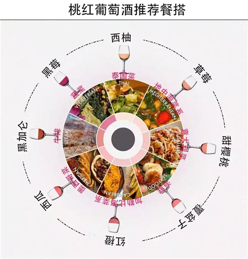 桃紅葡萄酒是“配餐小能手”,幾乎能與所有的菜肴搭配。為方便各位對(duì)桃紅葡萄酒和各種菜肴進(jìn)行搭配,下圖是各種桃紅葡萄酒推薦搭配的菜肴。