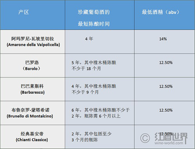 意大利用“Riserva”來(lái)表示珍藏,并對(duì)該詞的使用作出了嚴(yán)格規(guī)定。但不同于西班牙,意大利的規(guī)定并不統(tǒng)一,而是依各個(gè)產(chǎn)區(qū)的法規(guī)而定:“珍藏”葡萄酒的酒精度和陳釀時(shí)間均需要超過(guò)其所在產(chǎn)區(qū)的法定最低標(biāo)準(zhǔn)。因此,在意大利不同的產(chǎn)區(qū),“珍藏”葡萄酒需要滿(mǎn)足的標(biāo)準(zhǔn)大有不同,具體可見(jiàn)下表: