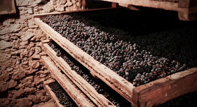 阿瑪羅尼葡萄酒獨(dú)樹一幟的風(fēng)格,離不開其令人津津樂道的釀造方法——帕賽托法(Passito Method)。帕賽托法指的是用風(fēng)干的葡萄釀造葡萄酒的工藝,因而又稱枯藤法(Appassimento)。每年葡萄成熟季時(shí),酒莊的工作人員會(huì)提前采收葡萄,這時(shí)葡萄的酸度還很高,采收后并不急著將它們送去釀酒,而是將葡萄放在通風(fēng)良好的室內(nèi)風(fēng)干幾個(gè)月,使果實(shí)流失部分水分,糖分和風(fēng)味物質(zhì)得以集中。這種方法可以為成酒增添風(fēng)味、酒體和酒精度。