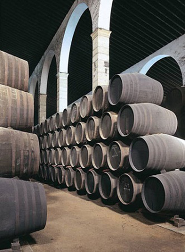 雪莉酒的強化發生在基酒發酵結束后,一般通過混入部分酒精濃度高達96%abv的蒸餾烈酒來將葡萄酒的酒精度提升至15-15.5%abv或17%abv。然后,酒液會轉入獨特的索萊拉(Solera)系統進行熟化。這種系統的特點在于將不同熟化期的酒液分層存放,然后在熟成過程中每隔一段時間就將年輕酒液與熟化較久的酒液混合,以保證每次釀出的雪莉酒風格一致,且品質穩定。雪莉酒的風味大多源自該熟化階段,其風格也與熟化時長和熟化方式等息息相關。