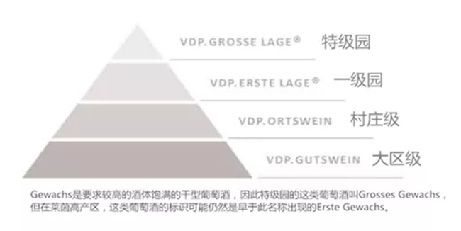 現(xiàn)在越來越能代表德國雷司令葡萄酒級別的是德國名莊聯(lián)盟(Verband Deutscher Pradikatsweinguter,簡稱VDP)倡導的針對葡萄果實天然特性進行的分類,即好葡萄酒不應該只擁有足夠高的潛在酒精度,還應該具有一定的原產(chǎn)地和其他方面的特色。