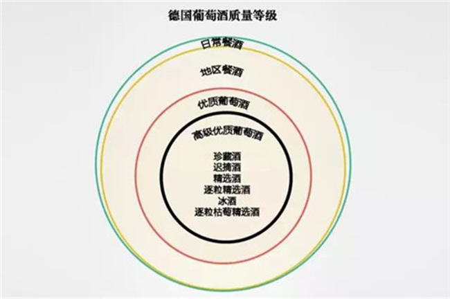 從圖中可以得知,目前德國葡萄酒主要分為 4 個等級,由低到高分別是:日常餐酒(Deutscher Wein)、地區餐酒(Landwein)、優質葡萄酒(Qualitatswein bestimmter Anbaugebiete,簡稱 QbA)和高級優質葡萄酒(Qualitaswein mit Pradikat,簡稱 QmP,2007 年更名為 Pradikatswein)。其中高級優質葡萄酒下又有 6 個細分,分別如下:
