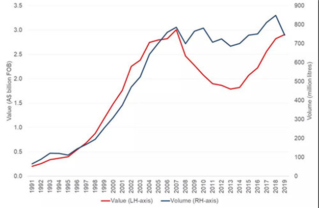 隨著市場對精品澳大利亞葡萄酒的需求日益增長,截至2019年12月底的12個月中,澳大利亞葡萄酒的出口總額增長了3%至29.1億澳元。