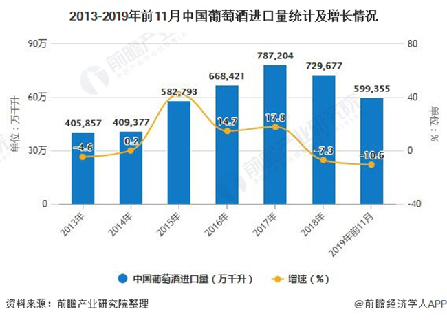 2019年前11月中國葡萄酒進口量接近60萬千升