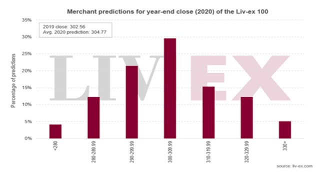 今年,Liv-ex會員預(yù)測優(yōu)質(zhì)葡萄酒市場將在2020年持平。平均而言,受訪者預(yù)測此行業(yè)基準(zhǔn)指數(shù)將上升0.7%,收于304.77點。 預(yù)測的中位數(shù)則稍低,為303.00點,上升0.1%。
