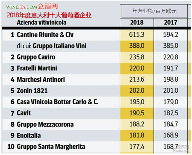 意大利雖然擁有超過10萬家酒莊,但是95%以上的酒莊年產(chǎn)量都在10萬瓶以下,即使是意大利排名前十大的企業(yè),除了GIV集團(tuán)年產(chǎn)值超過3億歐元,其余9家的產(chǎn)值都在2.5億歐元以內(nèi)。意大利的前十大公司經(jīng)營規(guī)模和綜合實力,與法國(拉菲羅斯柴爾德和卡思黛樂集團(tuán)年產(chǎn)值均超10億美元)、澳大利亞(2019年富邑20億美元產(chǎn)值)、智利(干露超過10億美元)、美國(嘉露超過30億美元)的大型酒業(yè)集團(tuán)規(guī)模差距較大。從葡萄酒生產(chǎn)的規(guī)模衡量,和國際大型酒商相比,意大利葡萄酒產(chǎn)量最大的Caviro集團(tuán)年產(chǎn)量也只能排在全球第15位。