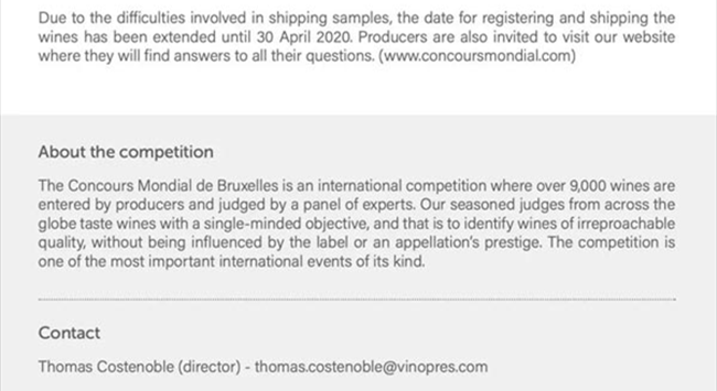基于當下新型冠狀病毒(Covid-19) 對于歐洲以及全球行業(yè)和國際旅行的影響,比利時布魯塞爾國際葡萄酒大獎賽組委會現(xiàn)正式?jīng)Q定對第27屆大獎賽進行適度延期。此決定旨在應(yīng)對和防止疫情進一步在歐洲地區(qū)擴散,從而保證大獎賽能夠有序順利舉行。