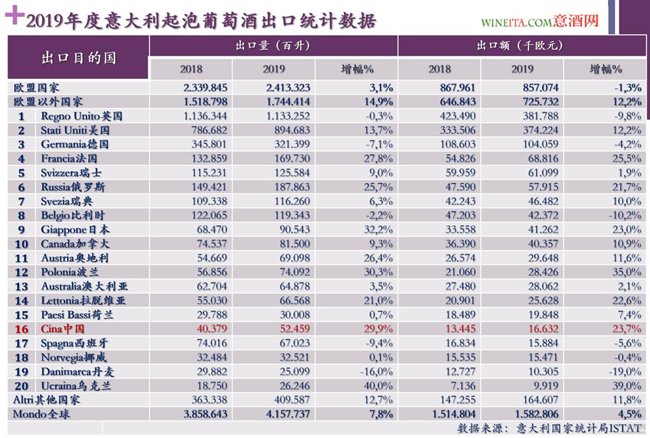 近日,意大利農(nóng)業(yè)和食品市場研究中心(ISMEA)發(fā)布《2019年度意大利起泡酒出口報(bào)告》。根據(jù)意大利國家統(tǒng)計(jì)局(ISTAT)的統(tǒng)計(jì)數(shù)據(jù),2019年意大利起泡酒出口量超過415萬百升,同比2018年增長7.8%。出口額為15.828億歐元,同比2018年增長4.5%。意大利起泡酒出口額的增長速度高于同時(shí)期意大利葡萄酒的整體出口額增速(3.2%),是意大利葡萄酒出口增長的有力引擎。