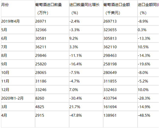 從數(shù)據(jù)來看,2020年1-4月中國葡萄酒進(jìn)口量與1-3月下降的17.4%將比,降幅再一次擴(kuò)大,進(jìn)口金額與1-3月的25.1%降幅相比,再次擴(kuò)大6%。與此同時,2020年3月中國葡萄酒呈現(xiàn)出量增價減趨勢,4月則量價齊跌。