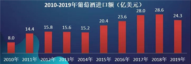 2020年一季度,中國(guó)葡萄酒進(jìn)口金額4.8億美元,同比下降21.9%。2010—2019年,年均復(fù)合增長(zhǎng)率為13.2%。