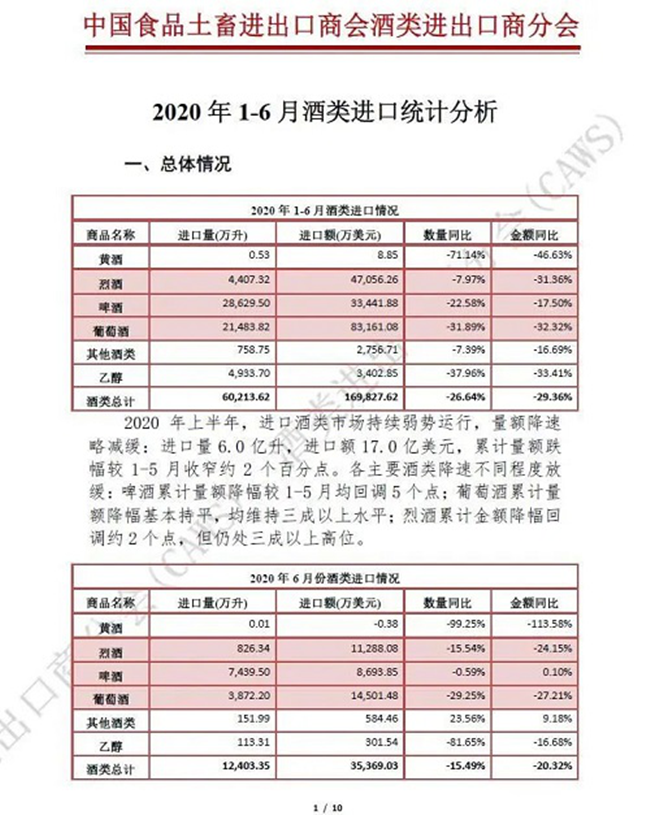2020年上半年,進(jìn)口酒類市場持續(xù)弱勢運(yùn)行,量額降幅略減緩:進(jìn)口量6.0億升,進(jìn)口額17.0億美元,累計(jì)量額跌幅較1-5月收窄約2個(gè)百分點(diǎn)。其中,上半年葡萄酒進(jìn)口量2.1億升,進(jìn)口額8.3億美元,累計(jì)量額降幅維持三成以上水平,在酒類進(jìn)口總額中占比下滑至49.9%。