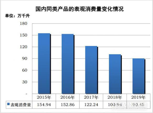 一方面,國內產業同類產品的產量由2015年的116.11萬千升下降至2019年的45.15萬千升,大幅減少61.11%。