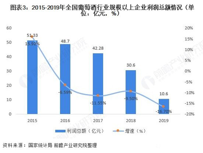 在營業收入與利潤總額方面,全國葡萄酒行業規模以上企業已經連續三年“雙降”。2019年全國葡萄酒行業規模以上企業實現營業收入145.2億元,同比下滑17.5%;實現利潤總額10.6億元,同比下滑16.7%。