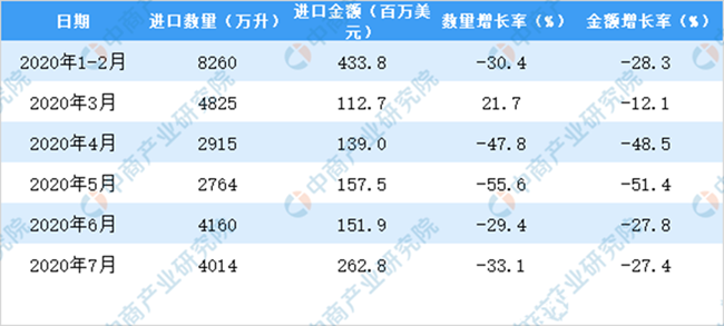 據中商產業研究院數據庫顯示,2020年1-7月中國葡萄酒進口量下降,2020年1-7月中國葡萄酒進口量為26922萬升,同比下降31.9%。
