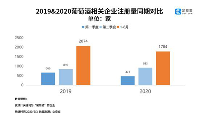 企查查數據顯示,今年上半年,我國葡萄酒相關的企業共注冊了1396家,同比下降7.9%。其中一季度注冊量為473家,二季度注冊量增長到923家。今年1-8月,我國葡萄酒相關企業的注冊量是1784家,同比下降14%。