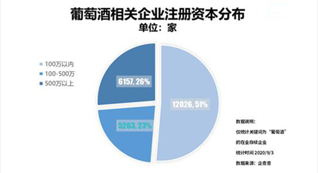 從企業注冊資本分布來看,我國有一半的葡萄酒企業注冊資本在100萬以內,共1.2萬家,占比企業總量的51%;注冊資本在100-500萬之間的企業數量最少,僅0.5萬家,占比企業總量的23%。