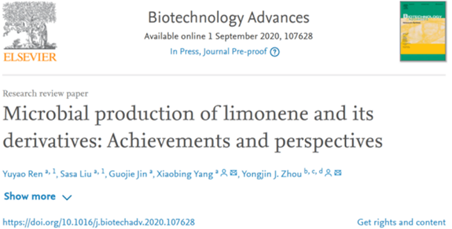 近日,葡萄酒學(xué)院楊曉兵副教授團(tuán)隊在著名生物技術(shù)學(xué)術(shù)期刊《Biotechnology Advances》(IF=10.744)發(fā)表了題為 “Microbial production of limonene and its derivatives: Achievements and perspectives” 的綜述文章,系統(tǒng)總結(jié)了近年來利用代謝工程和合成生物學(xué)策略合成檸檬烯及其衍生物研究進(jìn)展。西北農(nóng)林科技大學(xué)為第一署名單位,中科院大連化學(xué)物理研究所為合作單位;16級本科生任毓瑤和18級博士研究生劉灑灑為共同第一作者,我校楊曉兵副教授與大連化物所周雍進(jìn)研究員為共同通訊作者,我校靳國杰副教授參與了該綜述的撰寫工作。《Biotechnology Advances》是生物技術(shù)領(lǐng)域頂級國際期刊,在105種應(yīng)用微生物與生物技術(shù)相關(guān)的雜志中排名第3,該雜志全年收錄文章在100篇左右,2019年H指數(shù)161。