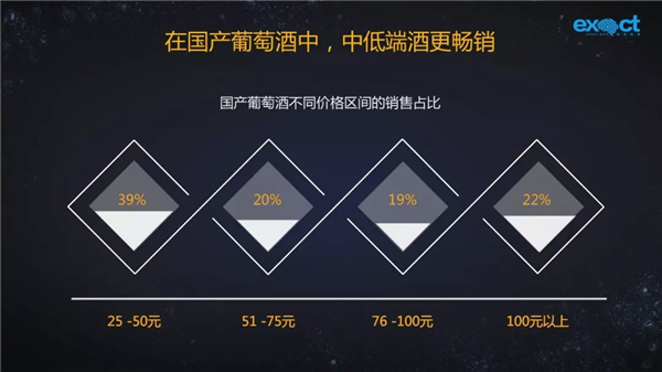 從消費(fèi)市場(chǎng)來看,國(guó)產(chǎn)葡萄酒銷量占比最大的價(jià)格區(qū)間集中在25-50元,其次是51-75元、76-100元。單價(jià)100元以內(nèi)的占據(jù)國(guó)產(chǎn)葡萄酒市場(chǎng)近八成。