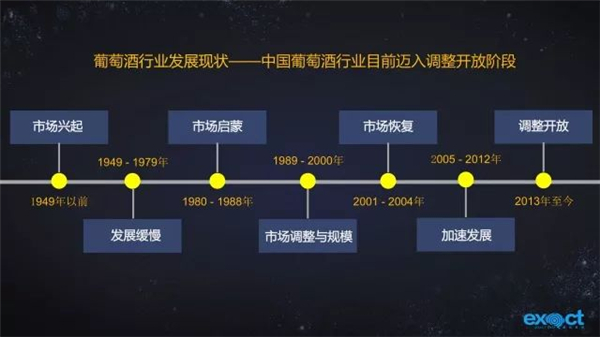 從產(chǎn)業(yè)發(fā)展的角度看,中國(guó)葡萄酒產(chǎn)業(yè)發(fā)展主要經(jīng)歷了7個(gè)階段,目前可以看出已邁入調(diào)整開放階段。