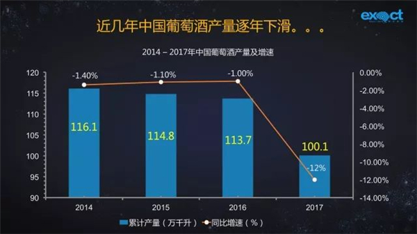 從統(tǒng)計(jì)數(shù)據(jù)看,2014-2017年,中國(guó)葡萄酒產(chǎn)量呈逐年下滑態(tài)勢(shì)。2017年中國(guó)葡萄酒產(chǎn)量為100.1萬千升,同比下滑12%。據(jù)業(yè)內(nèi)人士認(rèn)為,中國(guó)葡萄酒正處于調(diào)整優(yōu)化期,劣質(zhì)產(chǎn)能下滑,優(yōu)質(zhì)產(chǎn)能上升。一方面,進(jìn)口品牌對(duì)中國(guó)葡萄酒產(chǎn)業(yè)造成巨大沖擊;另一方面,低端低價(jià)競(jìng)爭(zhēng)把國(guó)產(chǎn)葡萄酒逼入死胡同。