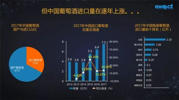 據(jù)統(tǒng)計(jì)數(shù)據(jù)顯示,2017年,中國(guó)消費(fèi)的葡萄酒中約1/3來自于進(jìn)口,進(jìn)口總量為7.5億升,同比增長(zhǎng)16.9%。其中七成多為瓶裝葡萄酒。從進(jìn)口來源國(guó)來看,中國(guó)進(jìn)口葡萄酒主要來自于法國(guó)、澳大利亞、智利、西班牙。