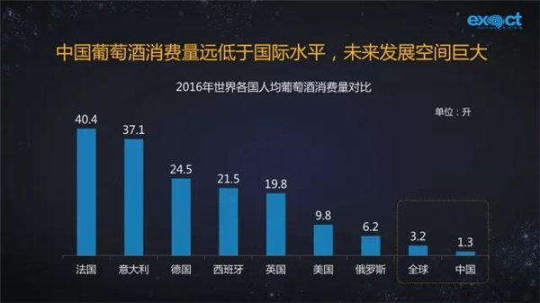 2016年,中國(guó)人均葡萄酒消費(fèi)量?jī)H為1.3升,與法國(guó)、意大利、德國(guó)有很大差距,也低于全球平均水平。中國(guó)葡萄酒消費(fèi)還有很大的發(fā)展空間。