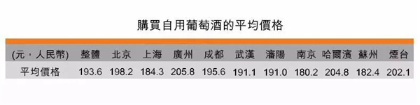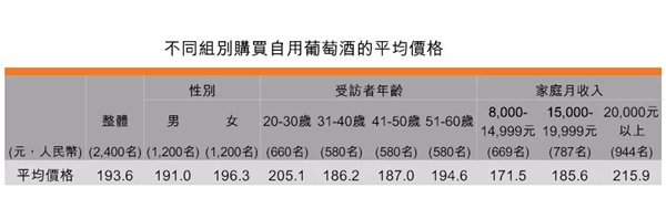 調查顯示,女受訪者購買自用葡萄酒的平均價格為196.3元,略高于男受訪者的191.0元。20-30歲消費者容易接受較高價格的葡萄酒,因為他們購買自用葡萄酒的平均價格為205.1元,相對其他年齡組別高。隨著家庭月收入上升,受訪者購買自用葡萄酒的價格也同時提高。