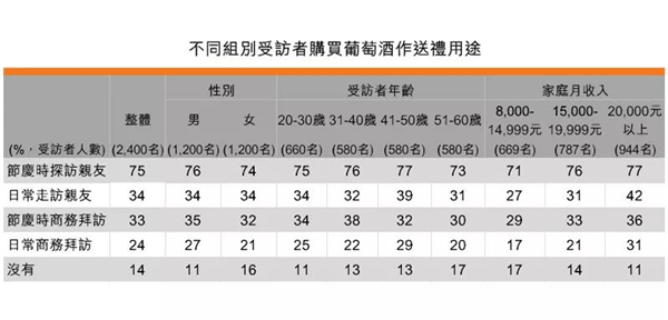 若以受訪者年齡區分,年輕受訪者以葡萄酒作為送禮用途的比例較年長受訪者高。例如20-30歲受訪者中有89%表示曾購買葡萄酒作為禮物,而51-60歲受訪者中則有83%。另外,家庭月收入越高,購買葡萄酒作為禮物的比例也越高。家庭月收入20,000元以上的受訪者中有89%表示有購買葡萄酒作為禮物,而家庭月收入在8,000-14,999元的則有83%。