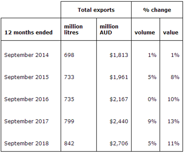澳大利亞葡萄酒對全球出口額和出口總量持續走強。截止到2018年9月30日的一年中,澳大利亞葡萄酒出口總額增長11%至27.1億澳元,出口總量增長5%至8.42億升(或900萬箱9升裝,見表2)。