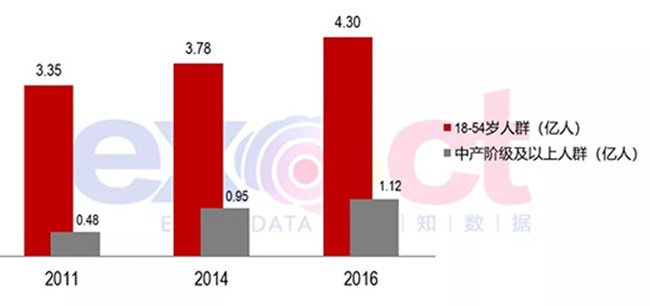 從2011年到2016年間,18-54歲葡萄酒消費人群擴大,由3.35億人增長到4.3億人。其中,中產階級以上人群(葡萄酒主力消費人群)不斷上升,從2011年0.48億人上升到2016年1.12億人。