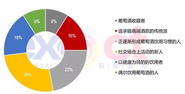 葡萄酒消費者根據消費偏好及飲用習慣可分為六類人群,包括葡萄酒收藏者、追求極高端酒款的傳統派、正逐漸行程葡萄酒飲用習慣的人等。