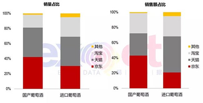 國產及進口葡萄酒各平臺市場份額占比(2017)