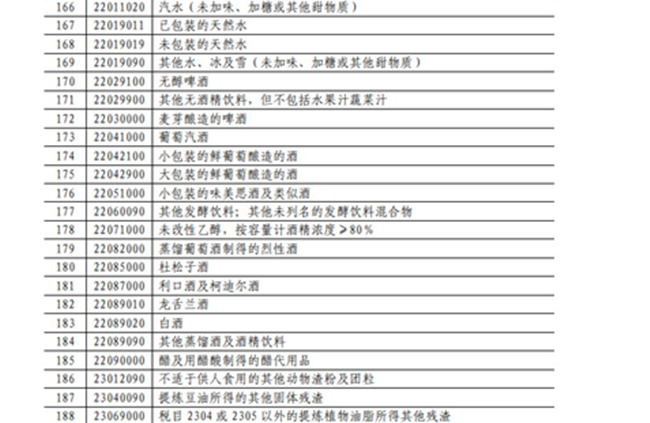 葡萄酒位于《對美實施加征25%關稅商品清單》中,“葡萄汽酒”、“小包裝的鮮葡萄釀造的酒”、“大包裝的鮮葡萄釀造的酒”、“小包裝的味美思酒及類似酒”4個類目均在列。此外,各種烈性酒、啤酒的類目也在這份清單中。