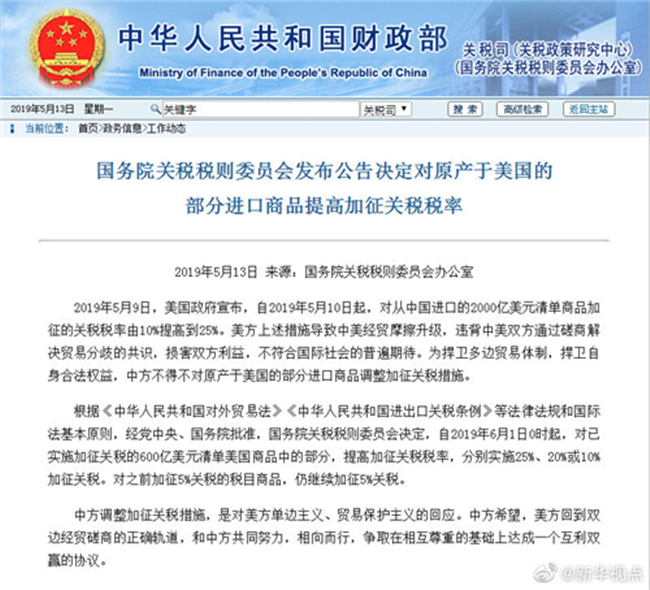 昨日,國務院關稅稅則委員會辦公室發布名為《國務院關稅稅則委員會發布公告決定對原產于美國的部分進口商品提高加征關稅稅率》的公告,公告顯示:
