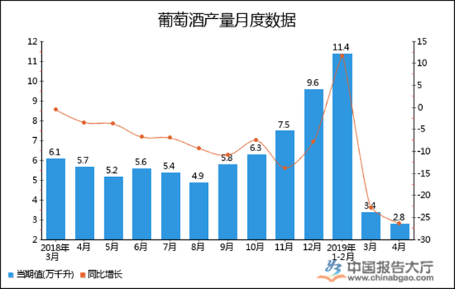 根據(jù)中國報告大廳對2019年1-4月全國葡萄酒產(chǎn)量進(jìn)行監(jiān)測統(tǒng)計顯示:2019年4月全國葡萄酒產(chǎn)量2.8萬千升,同比下降26.3%,2019年1-4月全國葡萄酒產(chǎn)量為13.4萬千升,累計下降26.8%。
