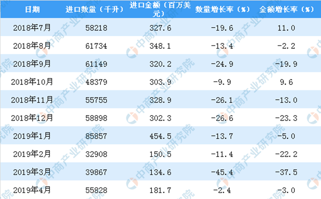 2018年-2019年4月中國葡萄酒進口數量及金額增長率情況