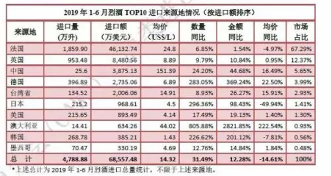 數據顯示,在過去5年中,全球烈酒市場以平均每年4.7%的速度增長,預計到2020年,市場消耗量仍將增加1.2億箱,突破32億箱大關,其中,增長的最大份額將來自中國。從酒類進出口商分會公布的數據來看,2019年上半年,烈酒進口量實現了超三成的增長,進口額也實現了12.28%的增長。從來源國來看,法國均價下降4.97%,但進口量繼續保持增長,市場占比仍據首位;英國量額增幅有一定下滑,但仍居第二;日本、澳大利亞、韓國延續高速增長。