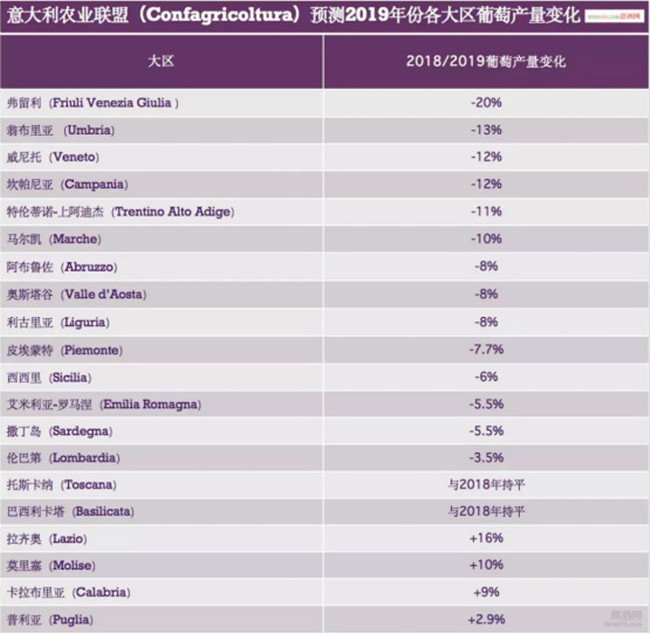 意大利農(nóng)業(yè)聯(lián)盟(Confagricoltura)研究中心也主要針對2019年意大利各大區(qū)的葡萄產(chǎn)量進(jìn)行了預(yù)測。在分析了來自個大區(qū)主要葡萄酒產(chǎn)區(qū)的代表性酒莊的葡萄樣本之后,意大利農(nóng)業(yè)聯(lián)盟(Confagricoltura)研究中心認(rèn)為,2019年,意大利大部分地區(qū)的葡萄產(chǎn)量都將出現(xiàn)不同程度的下降。其中弗留利(Friuli Venezia Giulia )大區(qū)的葡萄產(chǎn)量降幅最大,預(yù)計將比2018年減少20%。翁布里亞、威尼托、坎帕尼亞、特倫蒂諾-上阿迪杰、皮埃蒙特、艾米莉亞-羅馬涅等大區(qū)在2019年的葡萄產(chǎn)量都將出現(xiàn)不同程度的降幅。