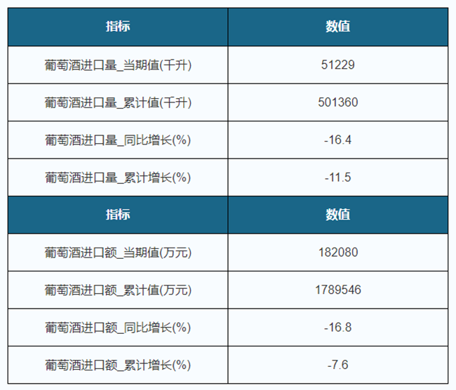 2019年9月我國葡萄酒進口量為51229千升,同比下降16.4%,進口金額為182080萬元,同比下降16.8%;1-9月進口量為501360千升,累計下降11.5%,進口金額為1789546萬元,累計下降7.6%。