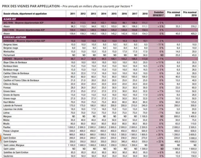 1) 漲幅高達+22%的圣艾斯戴夫產區(St. Estèphe),由2017年的45萬歐元/公頃上漲到2018年的55萬歐元/公頃。