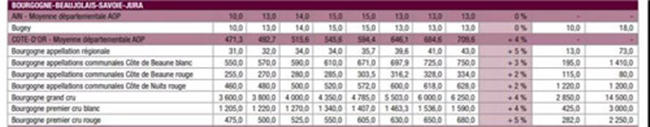 博艮第產區金丘所有AOP葡萄園都呈上漲趨勢,漲幅也都很均勻,在2%到5%之間。其中漲幅最大的兩個AOP產區分別是“博艮第大區級別(Bourgogne Appellation Régionale)”,由2017年的4.1萬歐元/公頃上漲到2018年的4.3萬歐元/公頃,漲幅高達5%。另外一個漲幅高達5%的產區是“博艮第一級紅葡萄園”(Bourgogne 1er Cru rouge),由2017年的65萬歐元/公頃上漲到2018年的68萬歐元/公頃。