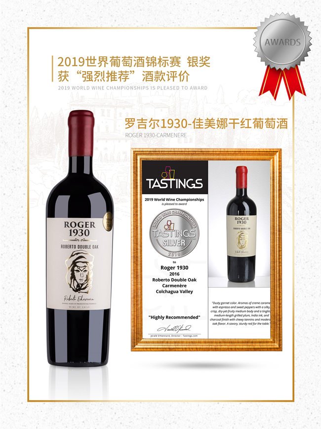羅吉爾1930-羅伯特紅葡萄酒呈深邃的寶石紅色;酒香非常柔和,伴有精致的黑加侖,黑李子的果香以及甘草、煙熏的香氣;口感優(yōu)雅豐富,層次鮮明且多變,單寧強(qiáng)勁,令人十分愉悅。在榮獲2020柏林葡萄酒大獎(jiǎng)賽金獎(jiǎng)的榮譽(yù)之前,就已經(jīng)獲得了2019世界葡萄酒錦標(biāo)賽金獎(jiǎng)的榮譽(yù),以及“無(wú)與倫比”酒款評(píng)價(jià)!