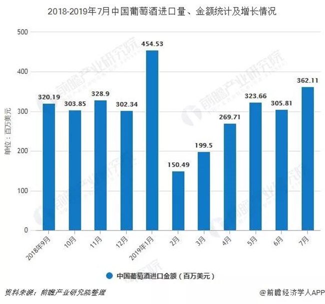 在進口金額方面,2019年7月中國葡萄酒進口金額為362.11百萬美元,2019年7月中國葡萄酒進口均價為0.6萬美元/千升,相比6月上漲了0.08萬美元/千升。2019年1-7月中國葡萄酒進口金額達到2056.34百萬美元,進口均價為0.52萬美元/千升。