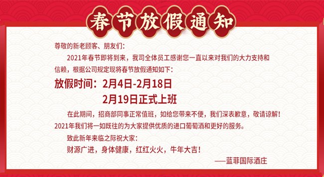 白駒過隙,又是一年春節(jié)到!惜別2020年,迎來了充滿希望、機遇和挑戰(zhàn)的2021年!正值中國的傳統(tǒng)節(jié)日“春節(jié)”來臨,在此藍菲酒業(yè)全體員工向大家拜個早年!恭祝大家新春快樂,財源廣進!...