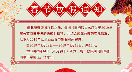 尊敬的藍(lán)菲代理商、經(jīng)銷商們: 值此新春即將來臨之際,藍(lán)菲酒業(yè)全體員工提前祝大家:新春快樂,闔家幸福。 自2019年1月29日2019年2月13日,共16天,為 藍(lán)菲酒業(yè) 春節(jié)假期,于2019年2月14日(正月初十)正式上班,放假期間公司安排人員正常值班,請悉知。 新春...